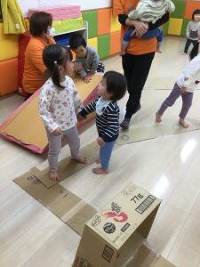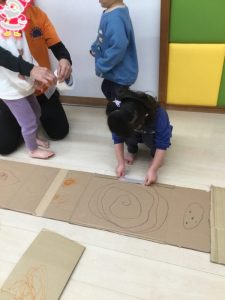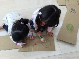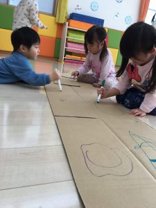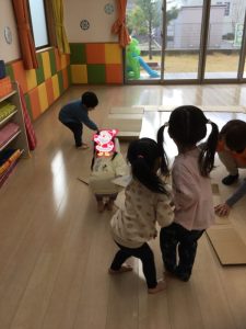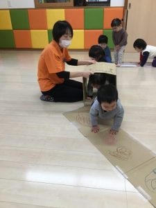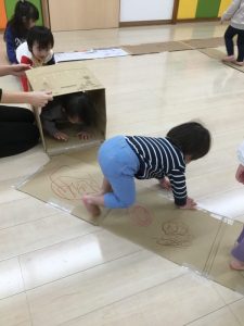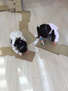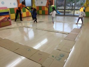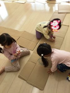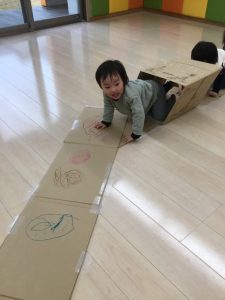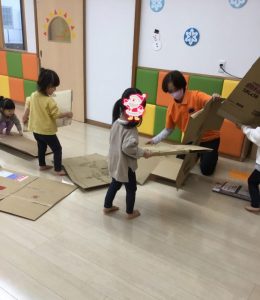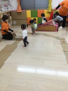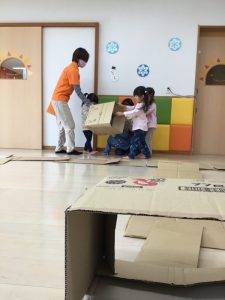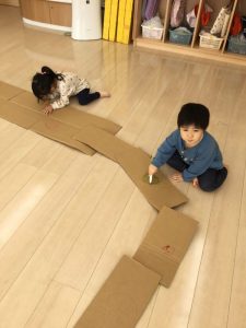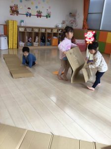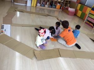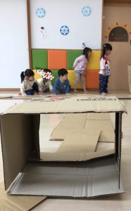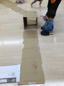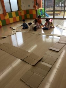 」と次は段ボールを使って大型迷路作りに取り組みました。