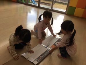 りんご組の子どもたちが先生と一緒に考え、友だちと力を合わせて大型迷路を完成させていく姿や小さい組のお友だちを誘ってみんなで楽しそうに遊ぶ様子を見てください![]()