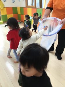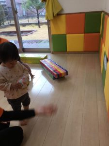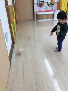 壁に貼ってある的に、0歳児は下から1.2歳児は上からボールを投げます。