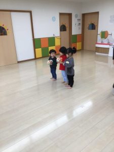 以前は1.2歳児も下から投げていましたが、今回は上から投げる練習です🎾