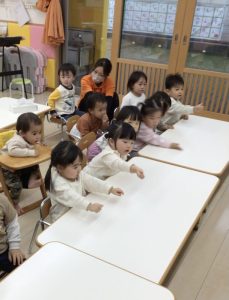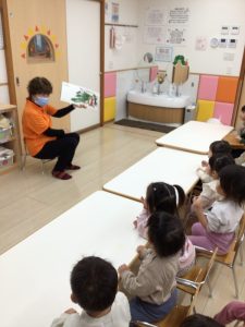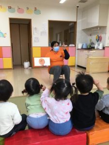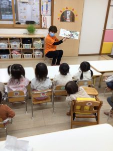 絵本を読み始めた時は先生の声に集中している子どもたちも、テンポの良い同じフレーズが繰り返されるうちにだんだんワクワクしてきて自然と声が聞こえ始めるんですよ