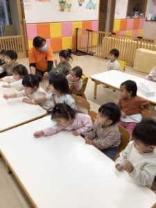子どもたちは同じフレーズが繰り返される絵本が大好きで、どんどん絵本の世界に入り込み、言葉を真似っこしたり体を一緒に動かしたりして、登場人物になりきって楽しんでいます![]()