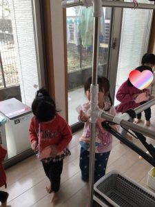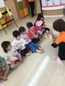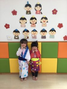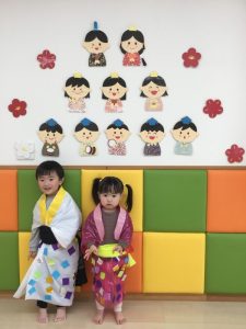 絵本を通してひな祭りの由来を聞いたり、カラービニール袋で作った着物を着たりしてワイワイと賑やかなひな祭り会でした![]()