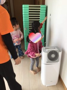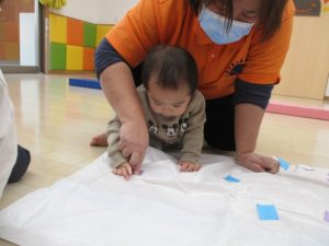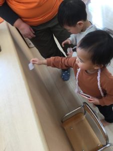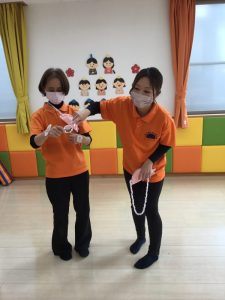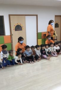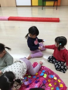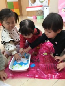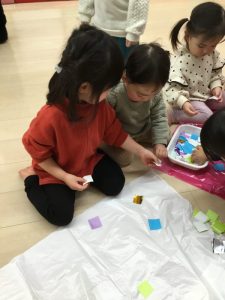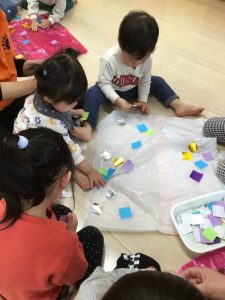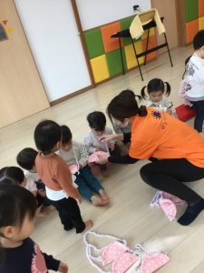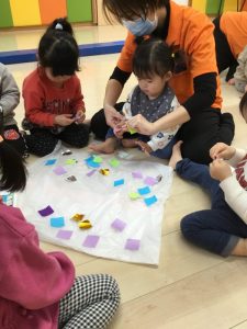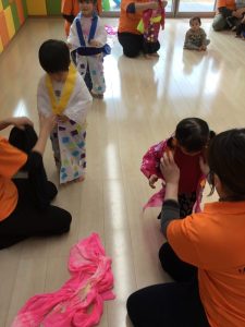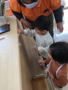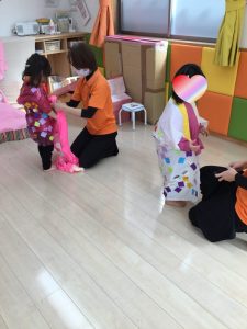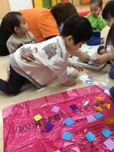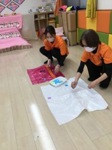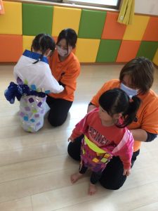 着物の模様付けの時には大きい組のお友だちがテープを剝がしてから小さい組のお友だちに渡してあげたり、小さい組のお友だちがお姉さんを慕って行ったりする姿を沢山見ることができ温かい気持ちになりました![]()