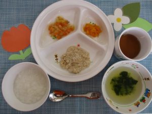 (写真は中期食です。月齢によって形、固さ、盛り付け量を変えて提供しています。)