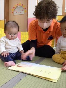 保育士が一方的に絵本を読むのではなく、子どもたちと一緒に絵本に触れたり、お話の世界を存分に楽しんだりしながら和やかな雰囲気の中で読み合うよう心掛けて日々の絵本を読んでいます