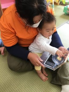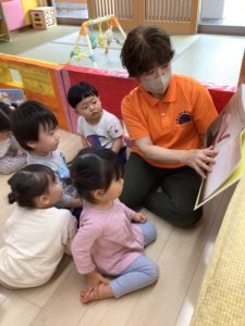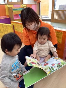 保育園では、午後のおやつの後にみんなで集まって1冊の絵本の読み合いをしたり、各クラスで月齢に合った絵本を楽しんだりしています。また、自由に遊べる時間には、本棚から好きな絵本を選んで来てパラパラめくったり、集中して見たりして絵本に親しめるような環境を整えています