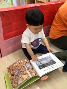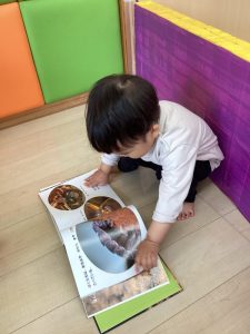 今週は、子どもたちが自分の見たい絵本を自由に選んで楽しんだり、先生に持って行って読んでもらったりしている様子をお伝えしようと思います