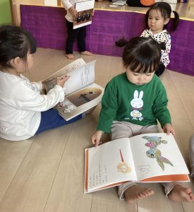 お気に入りの絵本をゲットしてひとりで楽しむ子、個々に違う絵本を持ちながらも友だちの温もりを感じながら安心して絵本をめくる子、「せんせい、読んでぇ~」と絵本を持ってくる子などスタイルは色々ですが、しっかり絵本と触れ合っている子どもたちです
