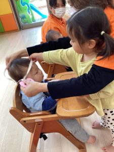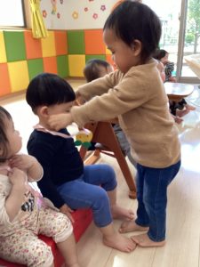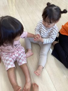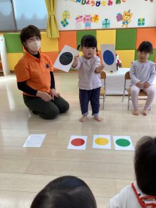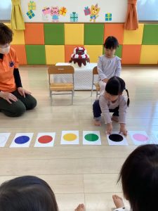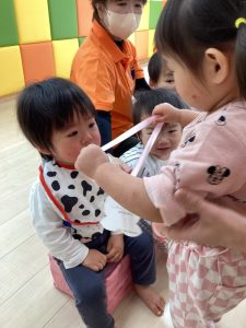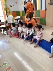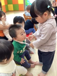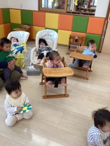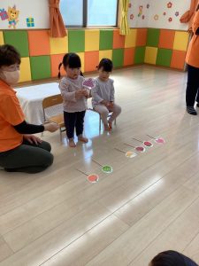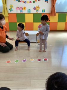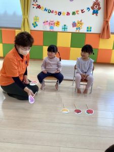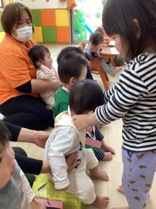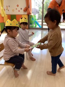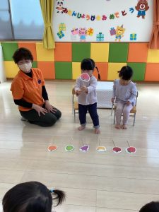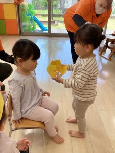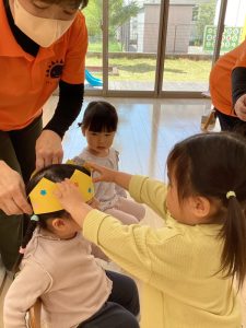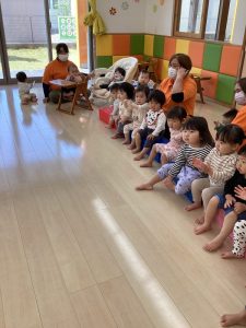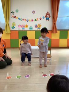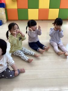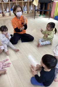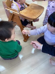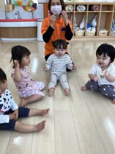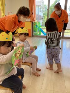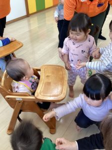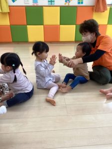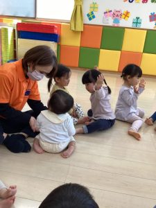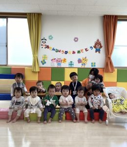 お誕生日のお祝いに、いつもは先生からの出し物プレゼントがあるのですが、今回は全園児で歌を歌ったり、手遊びや触れ合い遊びを楽しんだりして、みんなが仲良くなれる時間のプレゼントを企画して盛り上がりました