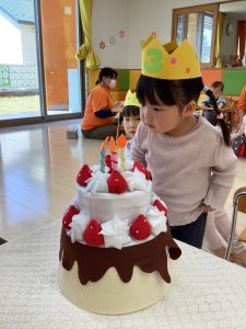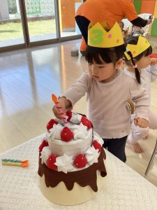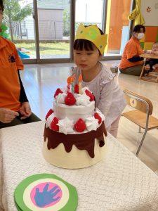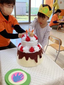 誕生日会では、誕生日のお友だちに色々なインタビューをしたり、冠やカードをプレゼントしたりします。また、大きなケーキにろうそくを立てて誕生日ケーキを完成させてもらったりもします