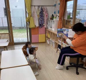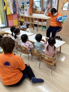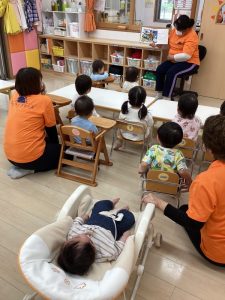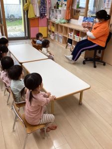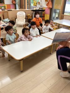 今回の絵本は17個のSDGs(持続可能な開発目標)の中の14番目のある「海の豊かさを守ろう」をテーマにしたお話でした。環境についての絵本で未満児の子どもたちには少し難しい所もあったのですが、うみがめのマリン君が買い物袋をクラゲと間違えてたくさん食べてしまい病院に運ばれた場面では、とても心配する声や不安そうな表情が見られ小さいながらも理解しているのだと分かりました![]()