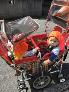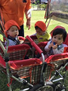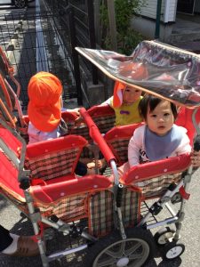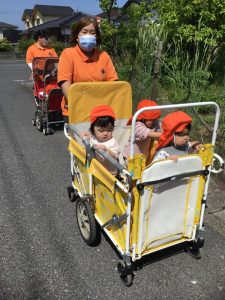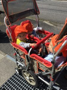 バギーに乗ったもも組さんは外の景色をキョロキョロ興味深そうに見ていましたよ。散歩車に乗っているいちご組さんは目新しいものを見つけると指をさして「見て、見て」と保育士にアピールしていました