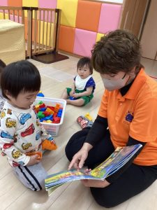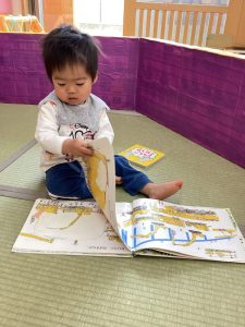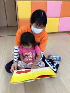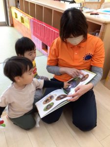 興味のある絵本を真剣に見たり、先生に読んでもらいながら会話も楽しんだりしている子どもたちです。