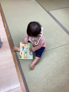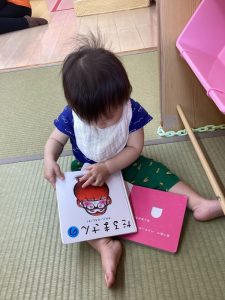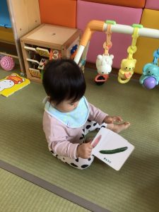 本棚に並んでいる絵本を次々と取り出して、その中から自分の気に入った絵本をチョイスする子どもたちの姿を見ていると、どんなに月齢が小さくても興味・関心を引く絵本があるのだという事が分かります![]()
