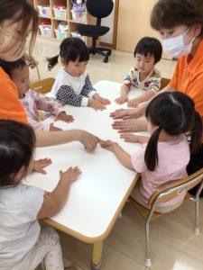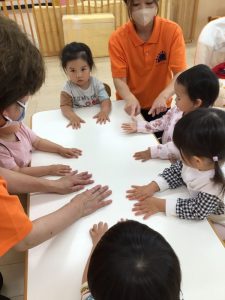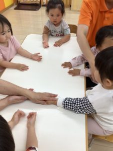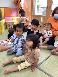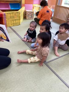 「おせんべやけたかな」の絵本では次はどのおせんべいが焼けるのかドキドキ・ワクワクしながら読み合うことが出来る絵本です。読み終わった後に、りんご組のお友だちは先生と一緒に「おせんべやけたかな」のわらべうた遊びも楽しみました![]()