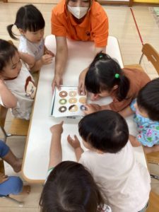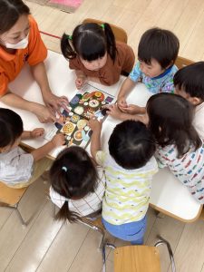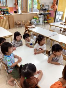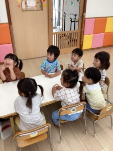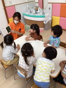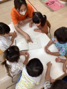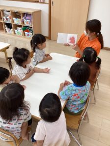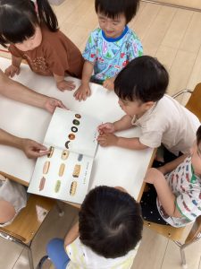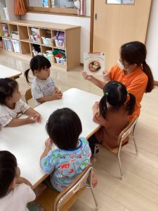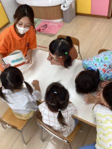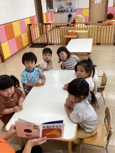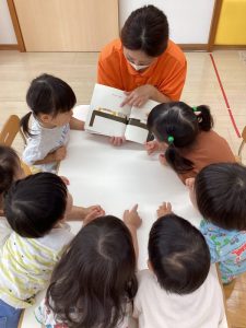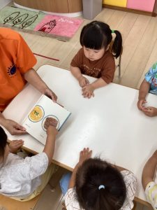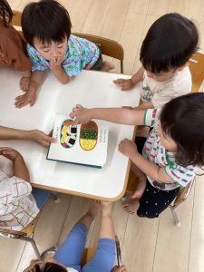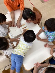 普段の読み合いでは、保育士が子どもたちの前に座って読んであげるスタイルが多いのですが、今回のようにクラスで絵本を読み合う時にはテーブルの真ん中に絵本を置いてみ〜んなで絵本に触れたり真似っこしたりして和気あいあいと楽しむ事が出来ます![]()