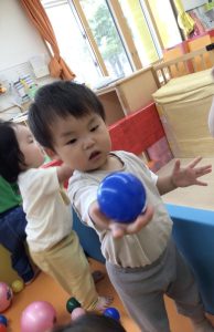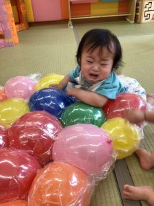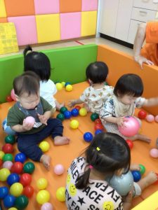 今回は、0歳児と1歳児さんが一緒に風船やボールプールで遊んでいる様子と2歳児さんのクッキングpart IIの様子をお伝えしようと思います![]()
