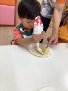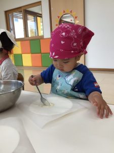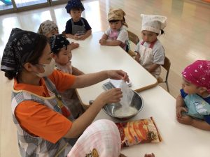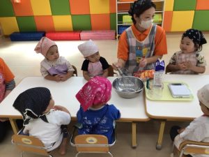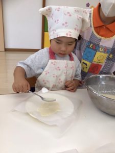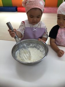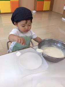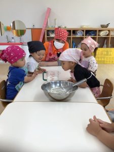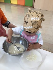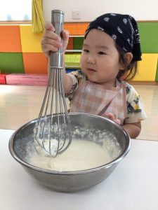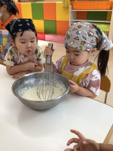 2歳児のお友だちは新しい事に挑戦する意欲が旺盛で、毎回、クッキングを楽しみにしています。「今日は、何を作るの❓」「自分で混ぜれるよ」等々頼もしい言葉がたくさん聞かれます![]()