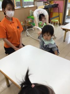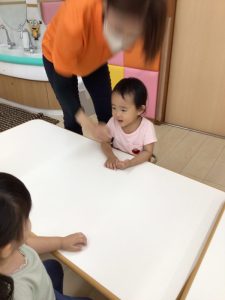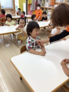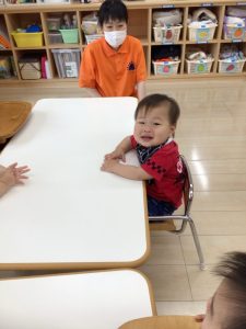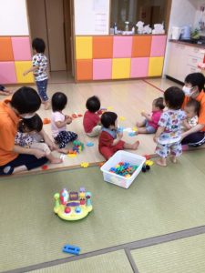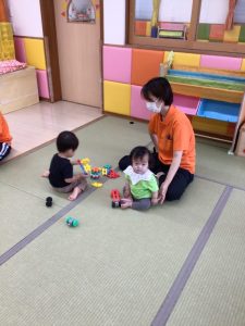 自由遊びの時にはお兄さんやお姉さんが遊ぶ様子をじっと見ていたり少しずつ寄って行って遊びの仲間に入れてもらおうとする姿を見る事が出来ます![]()