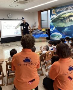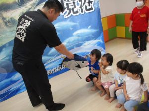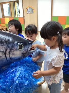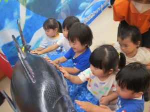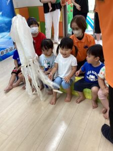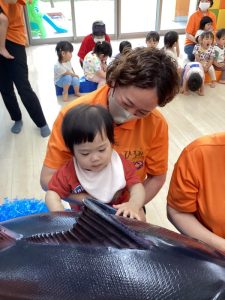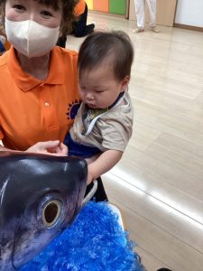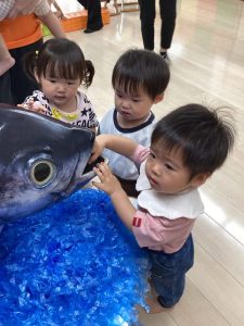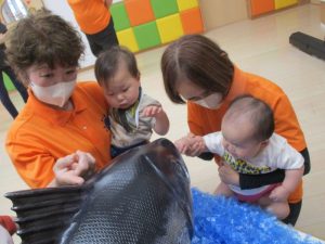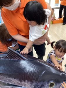 大きなマグロの模型やイカに驚きと怖さをおぼえながらも少~しずつ手を伸ばして触れてみようとする子どもたちの探求心も垣間見ることが出来、とてもステキなマグロ集会になりました