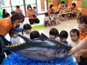 マグロ集会が始まった頃は「おっきな魚」と言っていた子どもたちも、会が進むうちに「マグロ~」と言うようになり、学びの吸収力の早さに驚かされました。