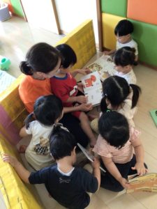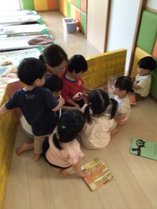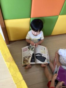 着替えの順番を待つ間に、先生やお友だちと絵本を楽しんでいる姿を見てください![]()
