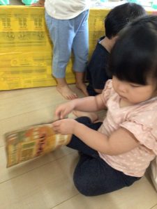 また、自分だけで楽しむのではなく隣に座ったお友だちと一緒に頭を突き合わせて見てみたり「かえっこしてぇ~」「いいよぉ~」と物の貸し借りの仕方を自然に学んだりしてとても有意義な時間になっています![]()