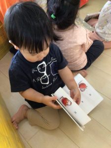 自分の好きな絵本を選ぶ事やお友だちと同じ空間で一緒に絵本を楽しむ事にワクワク感を感じているりんご組の子どもたちです![]()