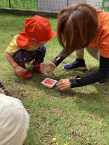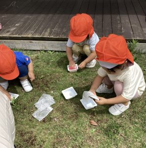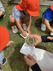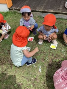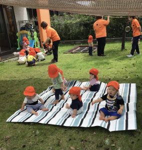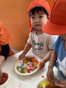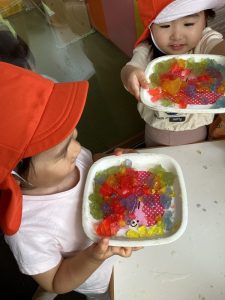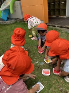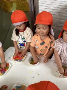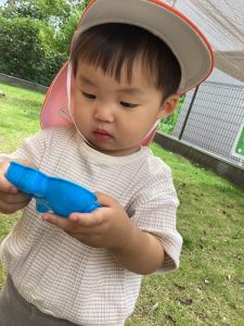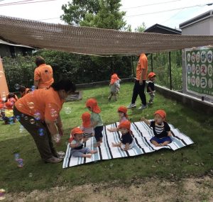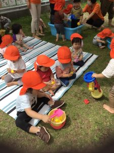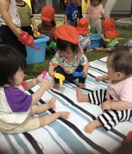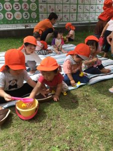 毎日びっくりするくらい気温が上昇していますが、園庭のタープの下は心地良い風が吹き抜けるので、境港園の子どもたちは色々な夏の遊びを楽しんでいます