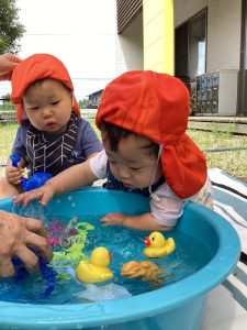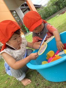 おもちゃを使って水遊び(1歳児)
