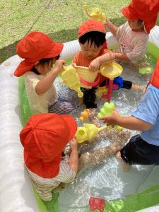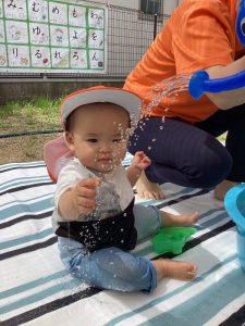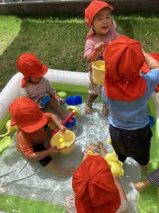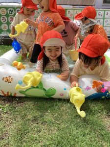子ども達は「晴れ」=「水遊び🚿」と思っていて、登園して来るとすぐに「今日は晴れだから水遊びする❓」と期待感満載で聞いてきます