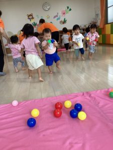 このたくさんのボールを両手に一つずつ2個だけ持って、反対側に敷いてあるマットまで運びます👐