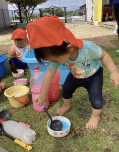 水遊びがメインの8月ですが、学年ごとに遊び方が違うので境港園では、曜日ごとに水遊びをする学年を決め、子どもたちが十分に楽しめるようにしています![]()