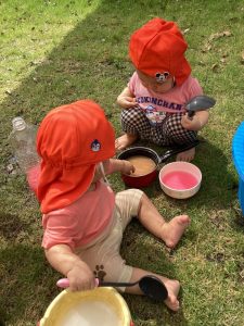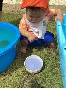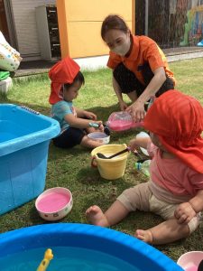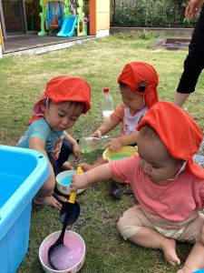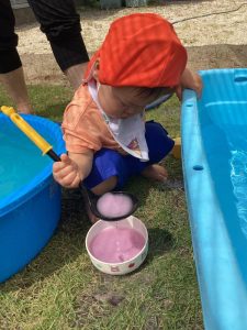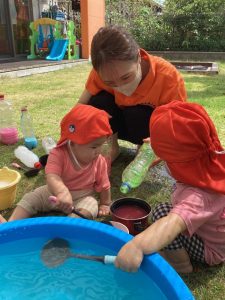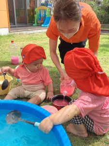 0歳児のお友だちは、いつもは透明の水なのに、この日は色々な色が付いている水(色水)にワクワク・ドキドキ💓