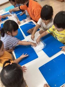 水遊びをしない日は、それぞれの学年で楽しい活動を考えて室内遊びを充実させています。水遊びが大好きな子どもたちも目新しい室内遊びに目をキラキラ![]()