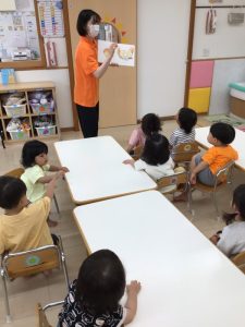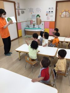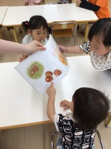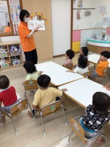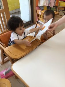 保育士が読む絵本を静かに見ているのではなく、絵本の中の繰り返しの言葉を真似っこしたり、食べる真似っこをしたりして心から楽しんでいる子どもたちです![]()