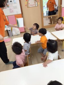 「しーっ」の絵本はウサギさんが色々な動物に「しーっ、しずかにしてくださーい。」と声を掛けていく繰り返しが面白くて読み合いの途中からウサギさんと一緒に「しーっ、しずかにしてくださーい。」とお願いする姿がとても可愛らしかったです![]()
