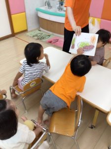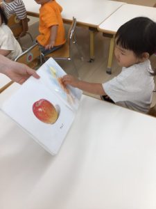 子どもたちが良く知っている果物が沢山でてくるので、ページをめくる度に大きな声で「スイカー