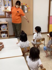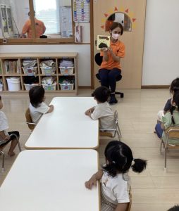 2歳児の絵本は「静と動」という対象の動きが子どもたちの遊び心をくすぐって「うごいた」と言うと手足をバタバタさせ「とまった」でピタッと止まる。この繰り返しを絵本を見ながら楽しんでいました