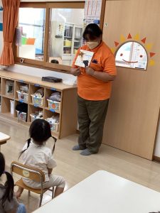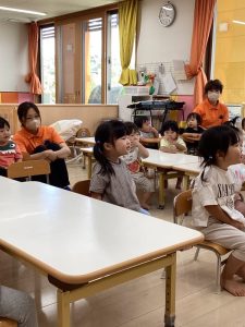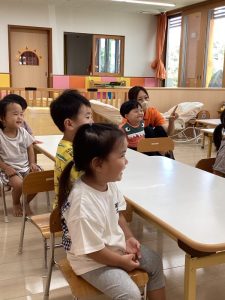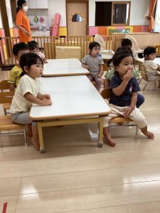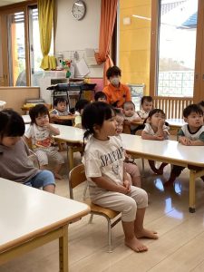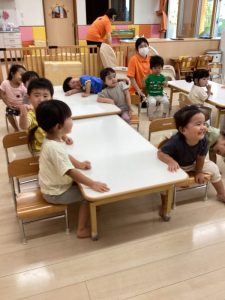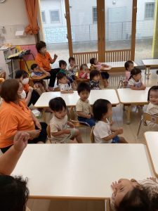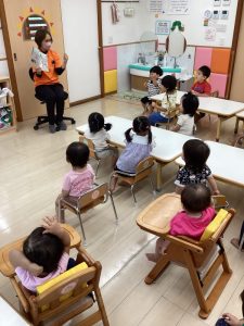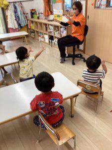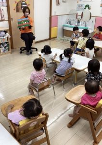 小さい子どもたちが興味を持つ「うんち」や「動く・止まる動作」「昆虫」が題材になっている今月の絵本に大盛り上がりのこどもたちです