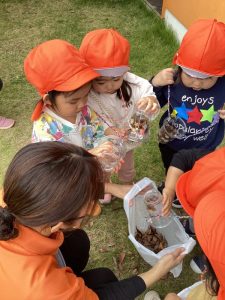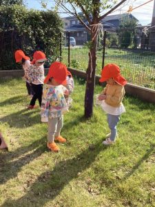 子どもたちは園庭の落ち葉を宝物の様に拾い集めることが大好きです。上を眺めていたら偶然にも葉っぱが「ひらひら~」となったら「葉っぱが落ちてきた~