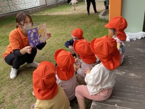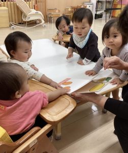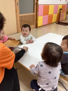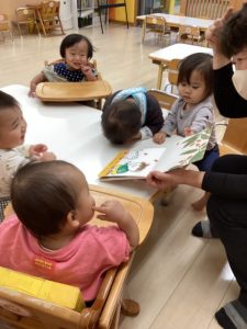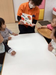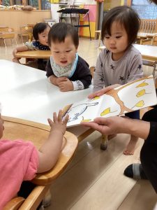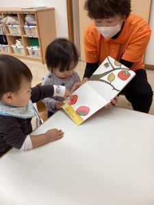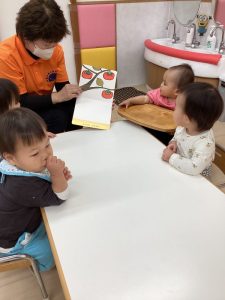 0歳児の絵本は色々な果物や木の実などが面白い音で落ちてくるので、もも組の子どもたちはその音の響きを楽しんでいました![]()