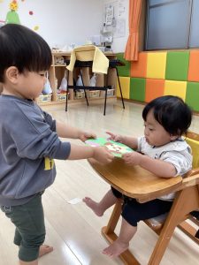 普段から異年齢での関わりを大切にしているので、自然と違うクラスのお友だちの名前も覚えているんだなぁ〜と改めて感じる事ができたひと場面でした