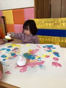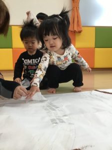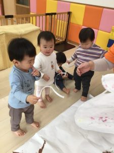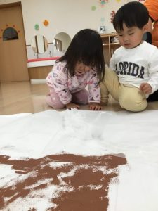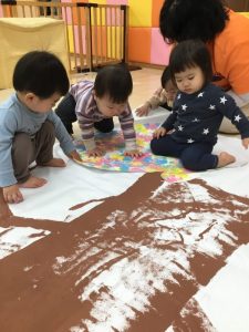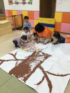 大きな模造紙にローラーを使って絵の具で枯れ木を描いてくれたりんご組さん。ところどころかすれている木で本当に寒い冬山をイメージさせてくれますよね![]()