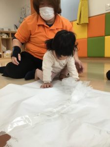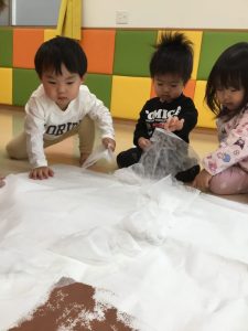 そんな寒そうな冬山も、もも組さんのパステル調のミトンや暖かそうなこたつのあるかまくら、かわいい洋服を着た雪の精が加わった事で楽しそうな雪野原に早変わりです![]()