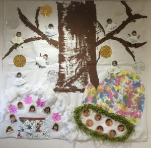 11月の下旬から各学年毎に作品作りに取り組み、それぞれ作った作品を大きな模造紙に貼り合わせていくと楽しそうな雪野原の完成です![]()