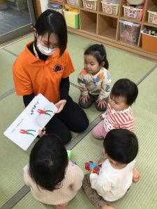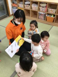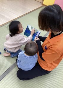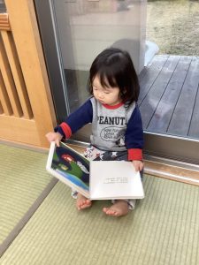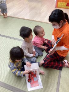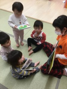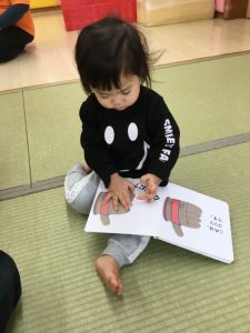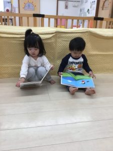 全体での読み合いではなかなか絵本に触れたりする事が難しいので、自由な時間に自分の好きな絵本を先生やお友だちとじっくり楽しめるというのはステキな事だと思います![]()