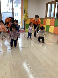 いちご組さんは揺れているロープをジャンプしたり、跨ぎます。