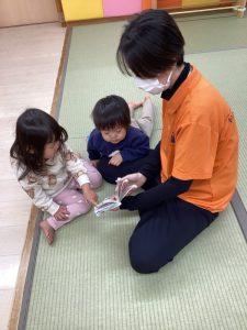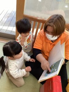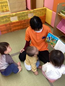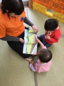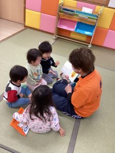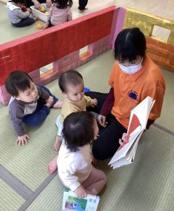 0歳児さんも自分のお気に入りの絵本があって先生の所まで持って来て絵本を差し出してくれるようになりました
